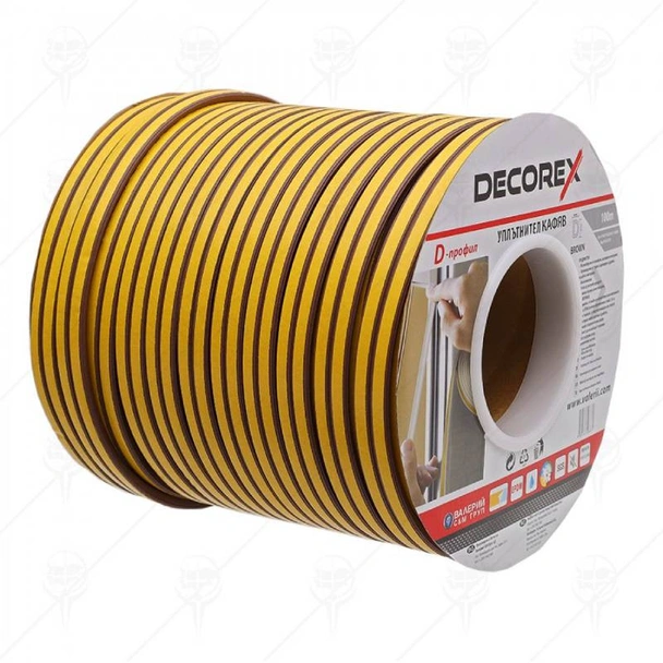 Уплътнител DECOREX е готов за употреба продукт. Предназначен е за уплътняване на врати и прозорци, кафяв на цвят, профил P. Уплътнителят е с ширина 5.5 мм и дължина 100 м. Произведен от траен, надежден и удобен за работа материал. Лесен е за монтаж, изработен е от EPDM (етилен-пропиленова гума). Характерно за този вид гума е, че възвръща първоначалната си форма след продължителен натиск.