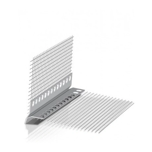 PVC ъглов профил с интегрирана алкалоустойчива стъклотекстилна мрежа и скрита водооткапваща част за монтаж при топлоизолиране на фасади.