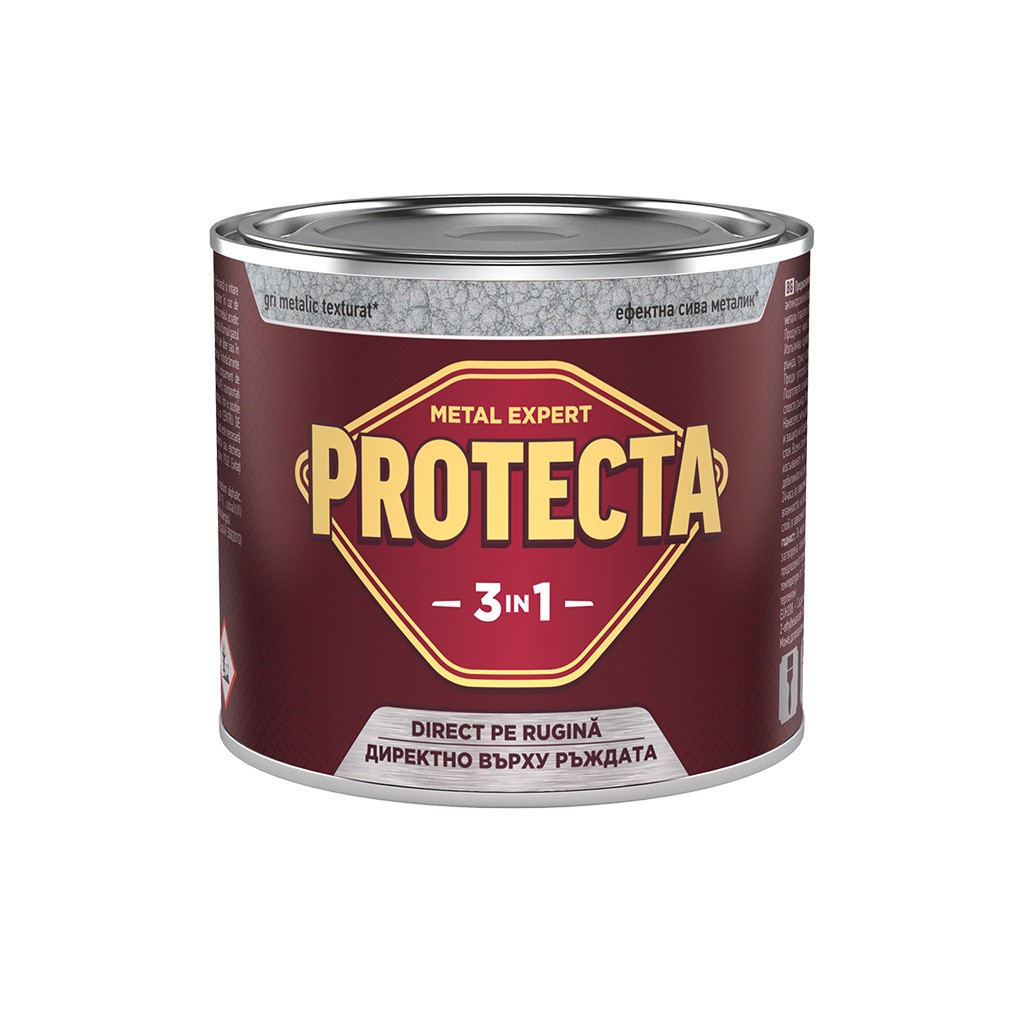 Представяме ви Боя за метал PROTECTA 3 в 1 в разфасовка от 500 мл – практично и високоефективно решение за дълготрайна защита и декорация на черни метали. Този продукт е произведен с висококачествени алкидни смоли, преобразувател на ръжда и органични разтворители, което осигурява мощна тройна защита. PROTECTA 3 в 1 е създадена за лесно и ефективно обновяване на нови и ръждясали метални повърхности, като им придава елегантен сив цвят и дълготрайна устойчивост.