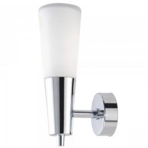 Има хромирана основа и матиран конусовиден разсейвател от стъкло.