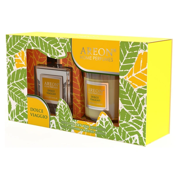 Комплект ароматизатор с пръчици 150 мл + свещ Сладко пътешествие AREON