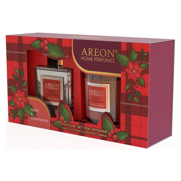 Комплект ароматизатор с пръчици 150 мл + свещ Ябълка и канела AREON