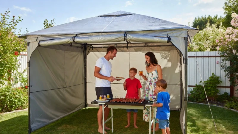 Използвайте проста формула: 1–1,5 кв.м на човек за седящи гости плюс място за барбекю или мебели. За 10–12 души изберете 3×4,5 м или 3×6 м (13,5–18 кв.м). За стоящи партита добавете 20 % повече площ. Измерете градината предварително и оставете 0,5–1 м свободно пространство отстрани за вентилация и достъп.