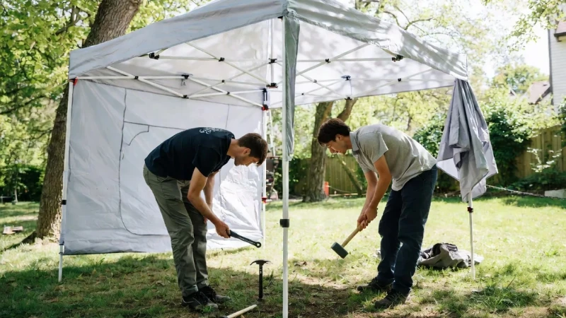 Използвайте метални колчета, пясъчни торби (по 25 кг на крак) или бетонни болтове. Добавете странични въжета и опъващи ремъци. Никога не оставяйте шатрата без закотвяне.