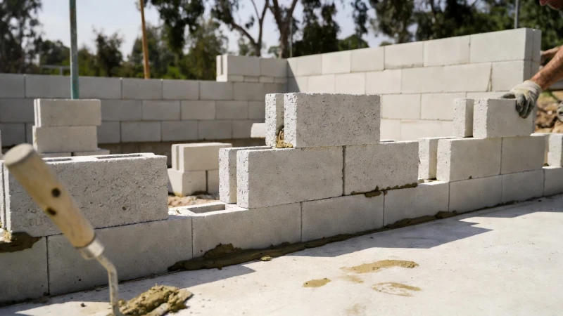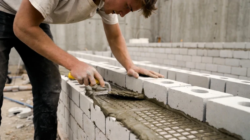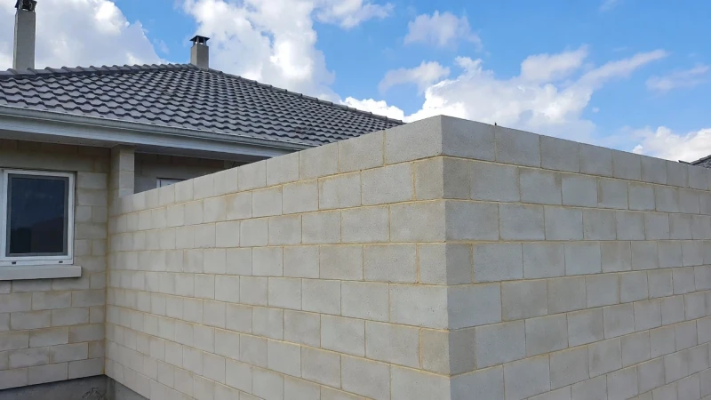 Първият ред е най-важен – той определя цялата стена. Използвайте дебел циментов разтвор за изравняване. Започнете от ъглите, поставяйте блоковете с помощта на шнур и проверявайте с ниво във всички посоки.