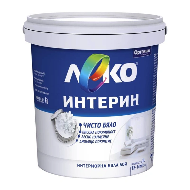 Латексът Леко Интерин от ОРГАХИМ е висококачествена интериорна боя, предназначена за ефективно и естетическо боядисване на стени и тавани в закрити помещения. Той представлява добре хомогенизирана суспензия, чийто състав включва фино диспергирани пигменти, пълнители, водоразредимо свързващо вещество и специфични добавки. Леко Интерин е в основен бял цвят и може да бъде лесно тониран в пастелни тонове с помощта на водни или универсални тониращи пасти и бои Хамелекон. Малката разфасовка от 1 л е удобна за дребни ремонти, проби или за боядисване на малки площи.