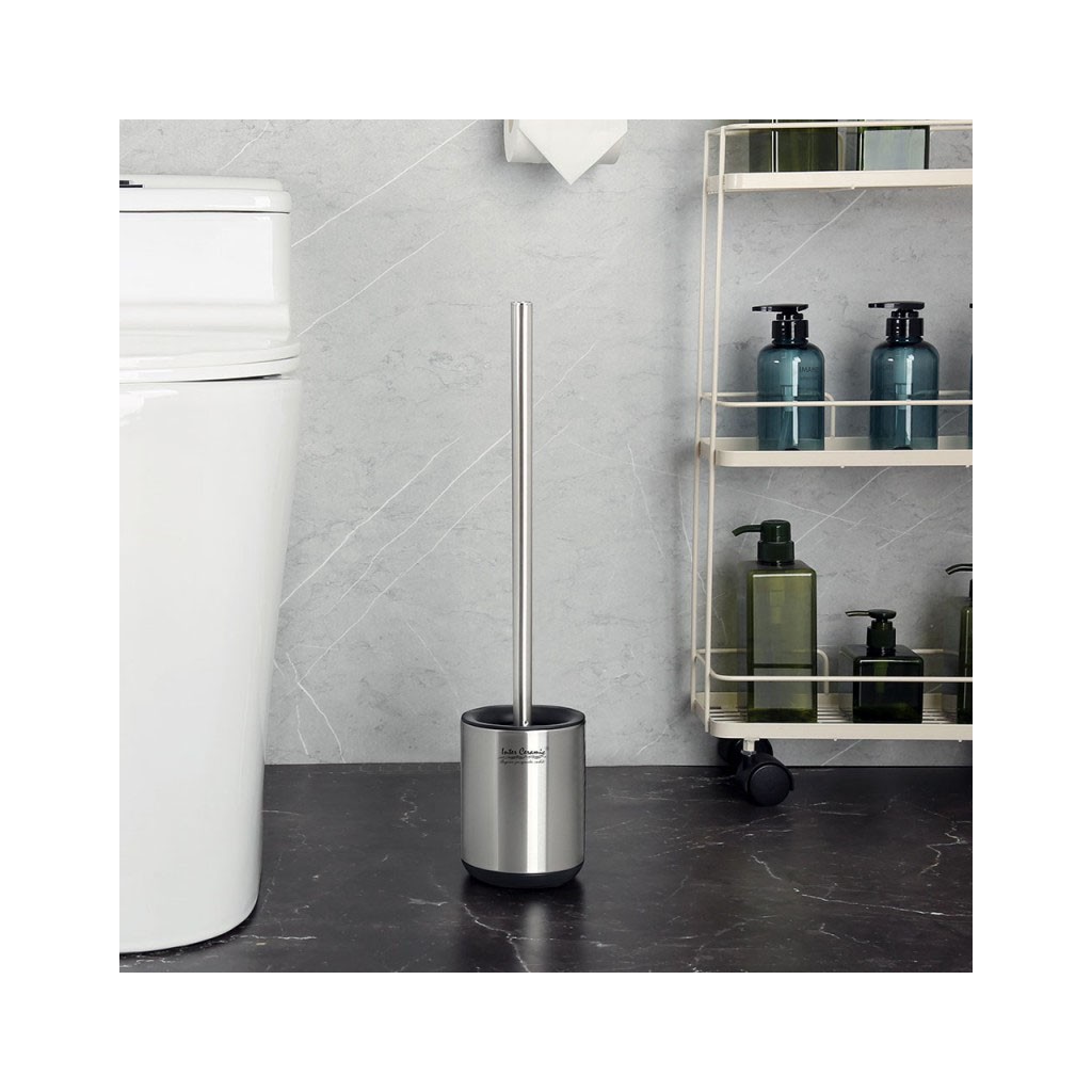 Четката се отличава с метална поставка в цвят металик и матово покритие, което не задържа отпечатъци и придава изискан вид. Ергономичната дръжка и специалната TPR глава осигуряват удобно захващане и ефективно почистване, без да надраскват повърхността на тоалетната чиния.