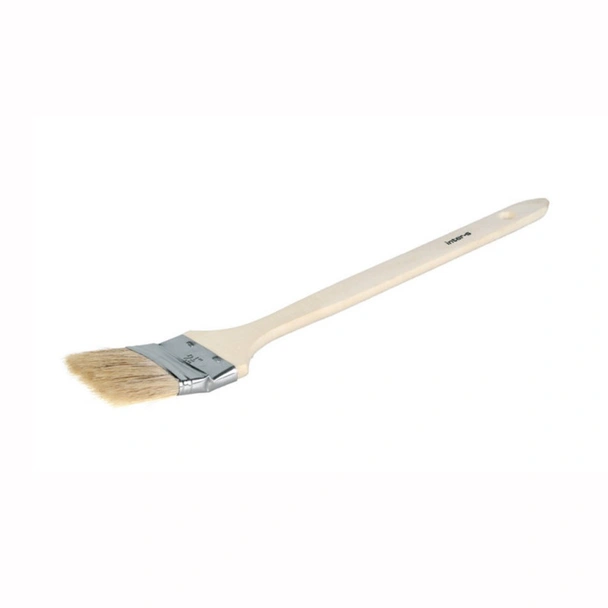 Работната част на инструмента е изработена от светъл косъм на четката от естествен произход, който се отличава с висока еластичност и попиваемост. Естествените нишки са оптималният избор за работа с алкидни системи и лакове, тъй като тяхната микроструктура задържа боята ефективно и я освобождава плавно, без пръскане. Нейната форма е плоска, но монтирана под специфичен ъгъл спрямо дръжката чрез извит метален вал. Този ергономичен чупещ се дизайн е ключов за достигане зад тръби, радиаторни ребра и дълбоки ниши, където е необходим паралелен на повърхността натиск.