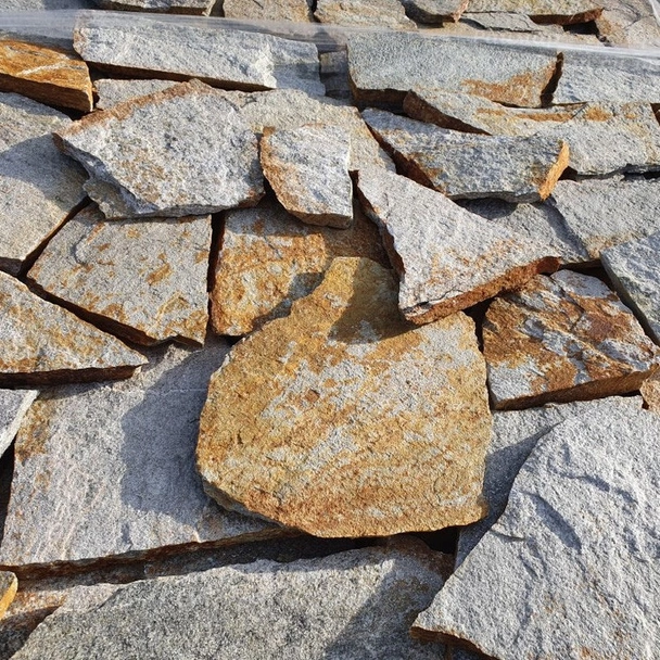 Постигнете естествена визия и устойчива облицовка на конкурентна цена с дребните неоформени плочи от Сребрист гнайс Металик. Идеален избор за цокли, фасади, декоративни стени и огради, този камък е практичен, естетичен и бюджетен.
