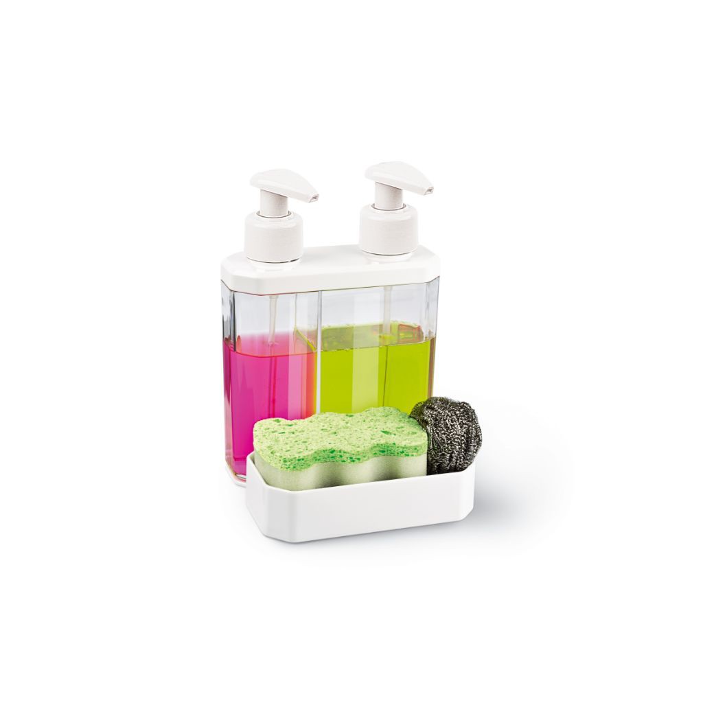 - Комбинира три функции в един продукт – дозатор за сапун, дозатор за препарат и поставка за гъба;