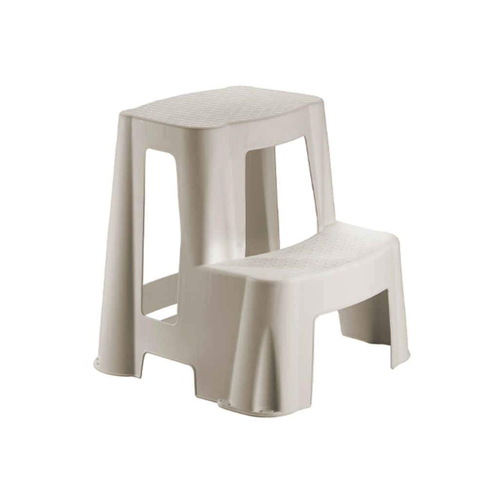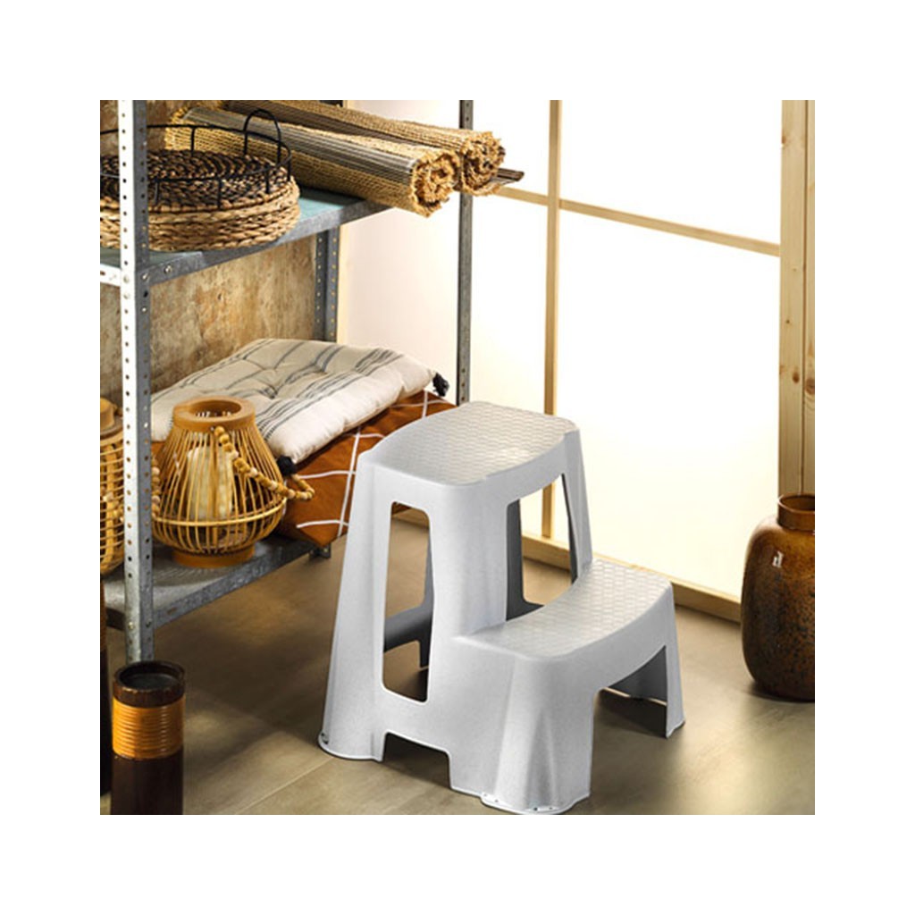 Голямата табуретка стълба на две нива е практичен помощник в домакинството, който осигурява безопасен достъп до високо разположени места. Изработена от здрав полипропилен в неутрален бял цвят, тя се вписва естествено във всеки интериор без да нарушава визуалната хармония. Противоплъзгащите стъпки гарантират стабилност и сигурност при използване, което прави продукта подходящ за всички членове на семейството.