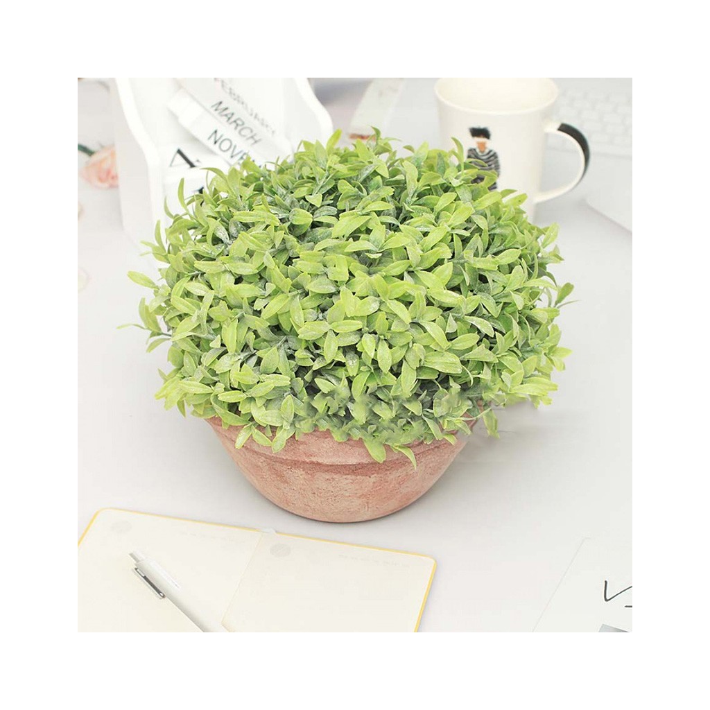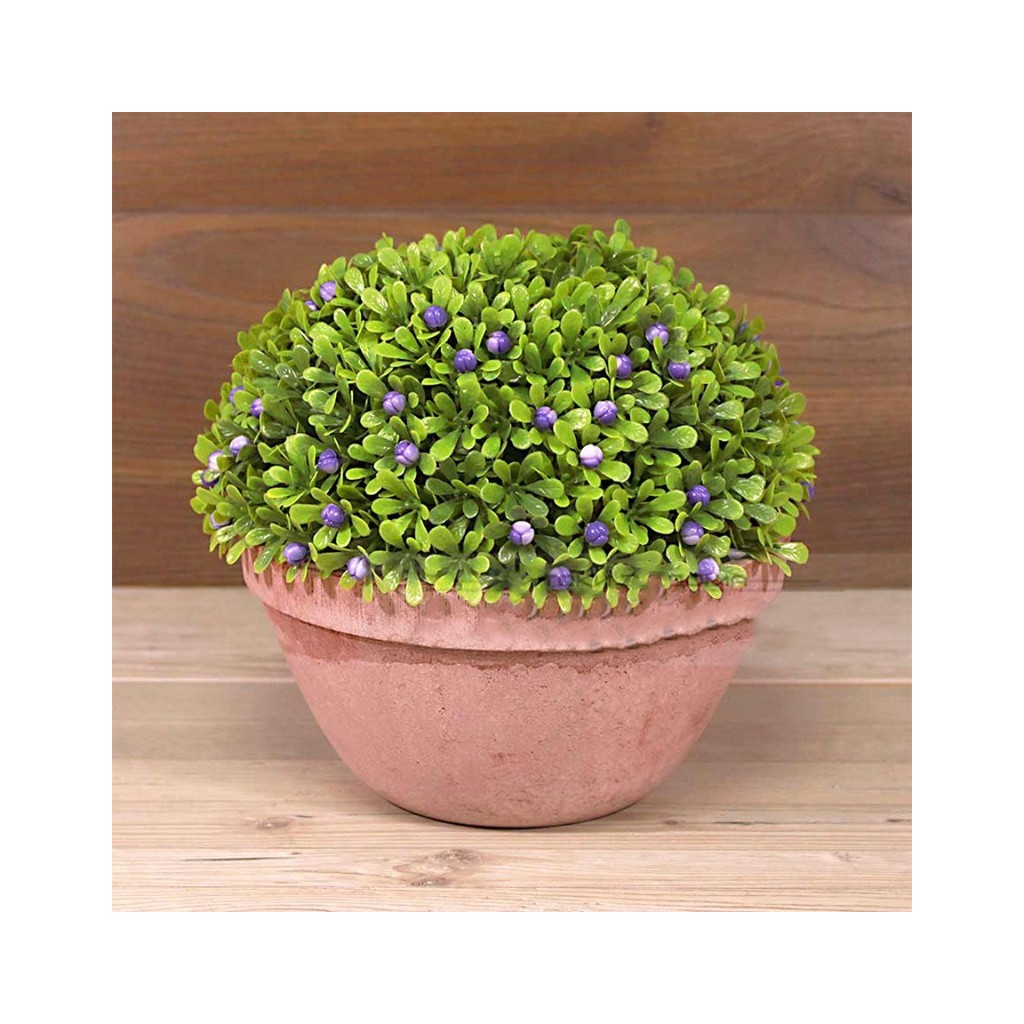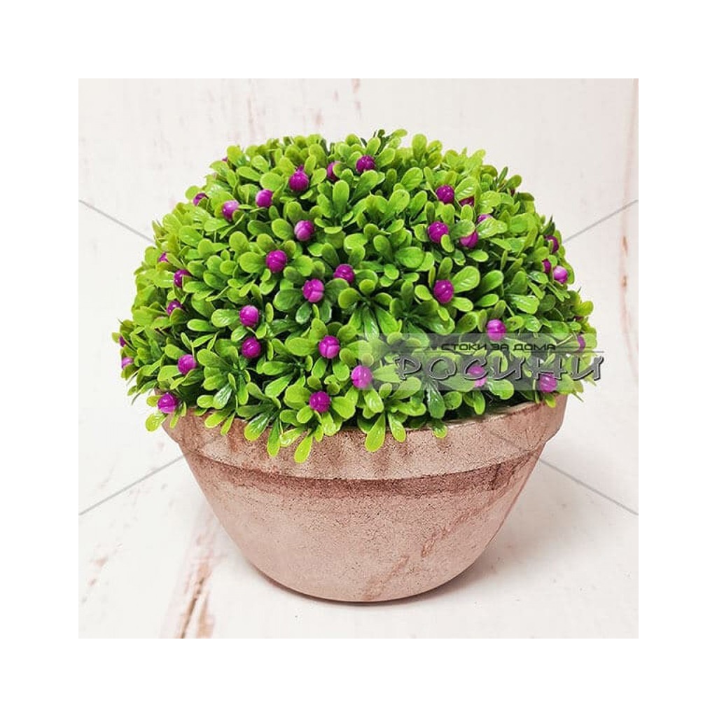 Изкуствен зелен храст с цветни пъпки в кашпа тип топка, подходящ за декорация на хотели, заведения, банки и студиа.