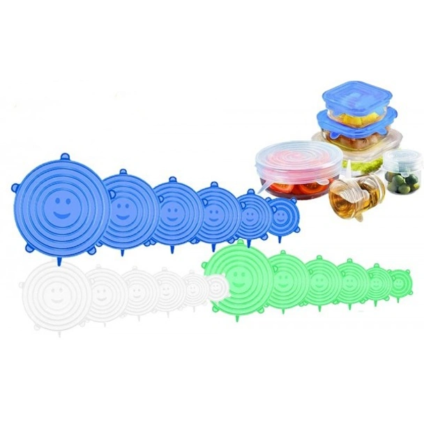 Комплект от шест броя силиконови капаци, предназначени за покриване и съхранение на съдове с неизконсумирани храни в хладилника или извън него.