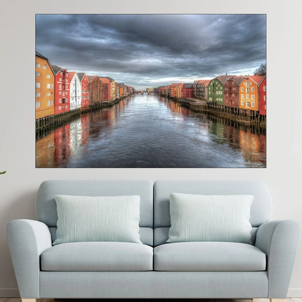 Декорация за стена (картина, пано) с мотив "Живописна река в Тронхайм - картина пано за стена". Изработена от олекотено PVC с дебелина 5 мм или канава от 100% памук, опъната върху дървена подрамка с дебелина 5 см. Изображението се печата с висококачествен UV печат, което е гаранция за запазване на цветовете с години!