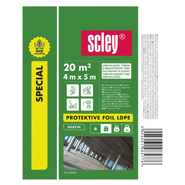 Екологичното защитно фолио Scley Hardy с размери 4 на 5 метра е иновативно и отговорно решение, създадено за потребителите, които се грижат за опазването на околната среда. Този продукт е произведен изцяло от рециклирани материали, преработени чрез съвременни технологии в устойчиво защитно покритие. Избирайки еко серията на Hardy, вие не само осигурявате надеждна бариера за вашия дом по време на ремонт, но и активно подпомагате намаляването на пластмасовите отпадъци и въглеродния отпечатък, свързан с производството на нови полимери.