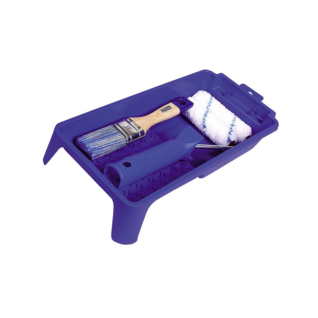 Компактна пластмасова бояджийска ваничка, предназначена за зареждане и отцеждане на ролката (10 см). Осигурява икономичен разход на боя и равномерно насищане на ролката благодарение на релефната си повърхност. Синият цвят е характерен за тази серия ванички.