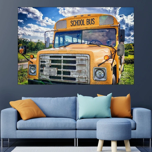 Декорация за стена (картина, пано) с мотив "Изоставен училищен автобус - картина пано за стена". Изработена от олекотено PVC с дебелина 5 мм или канава от 100% памук, опъната върху дървена подрамка с дебелина 5 см. Изображението се печата с висококачествен UV печат, което е гаранция за запазване на цветовете с години!