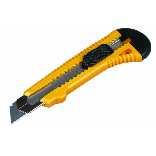 При нужда от надежден инструмент за ежедневно рязане Макетен нож 18 мм с чупещо острие Hardy е универсално решение за дома, офиса и работилницата. Този модел е създаден за прецизна и контролирана работа, като комбинира стандартно сегментирано острие с широчина 18 мм и механизъм за блокировка. Благодарение на това ножът позволява сигурно рязане на различни материали, без риск от нежелано прибиране на острието. Яркият жълт цвят осигурява добра видимост и улеснява откриването му сред останалите ръчни инструменти.