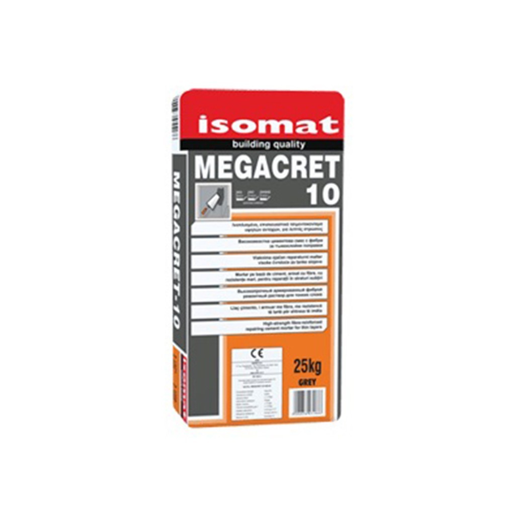 Високоякостна, полимер-циментова смес с фибри MEGACRET-10 ISOMAT в сив цвят, предназначена за поправки и възстановяване на бетонови елементи с повишени изисквания и дебелина до 10 мм.