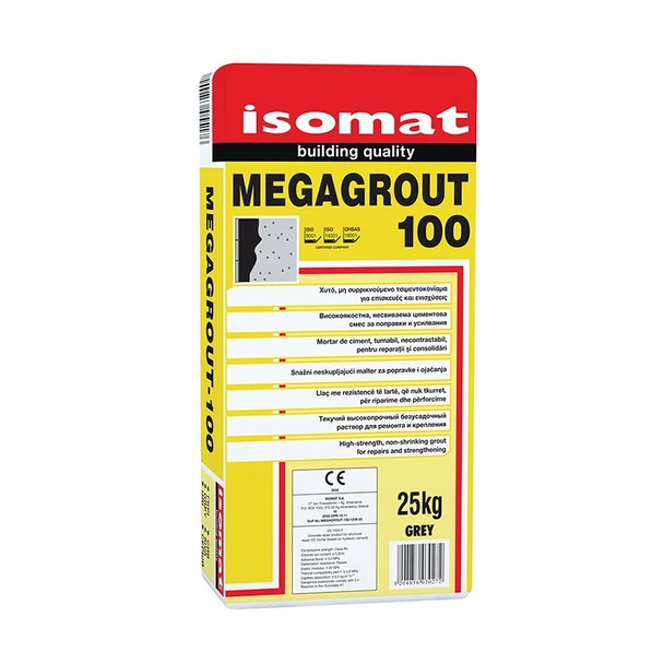 Високоякостна, течна, несвиваема циментова смес MEGAGROUT-100 ISOMAT в сив цвят, предназначена за поправки и възстановяване на бетонови конструкции.
