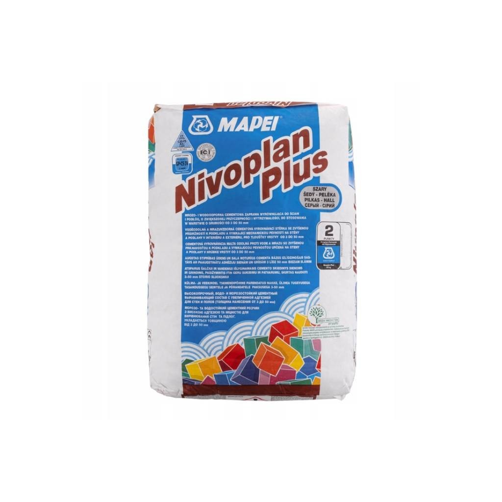 Nivoplan Plus е прахообразен изравняващ разтвор, със сив цвят, състоящ се от цимент, селектирани инертни материали,синтетични смоли и специални добавки, разработени в лабораториите за проучване и развитие на Mapei. След смесването му с вода се образува смес, която се нанася лесно върху вертикални и хоризонтални повърхности. Полагането на получената смес става с мистрия, маламашка или мазаческа машина.