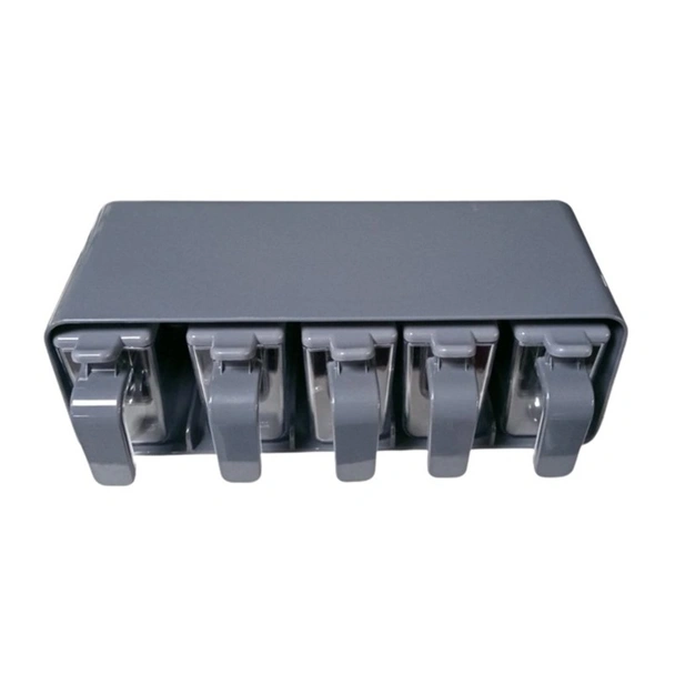 Съдовете са с прозрачен цвят, за да се виждат ясно подправките вътре, и с капаци и дръжки в сив цвят.