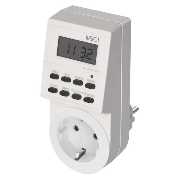 Дигитален таймер за контакт (тип шуко) P5521N на марката EMOS с 8 програми и голям дисплей, предназначен за домашна употреба.