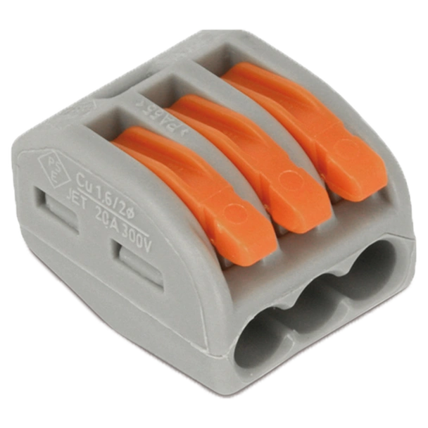 Тройна клема с размери 17,0/14,5/20,5 мм, сечение на проводника- 4,00м2, номинален ток- 32 А.