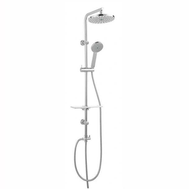 Душ-комплектът разполага с голяма душ глава за тропически дъжд с диаметър 20 см, която осигурява широка и релаксираща струя. За допълнителна гъвкавост, в комплекта е включен и подвижен душ с една функция и диаметър 10 см, който е идеален за насочено къпане. Металното окачване с плъзгач с дължина 985 мм позволява лесно регулиране на височината на ръчния душ, осигурявайки комфорт за всеки член на семейството. Комплектът е снабден с метален превключвател за душ с керамична вложка, който гарантира надеждна и дълготрайна работа. Практичната, плоска поставка за козметика осигурява удобно място за съхранение на душ гел и шампоан.
