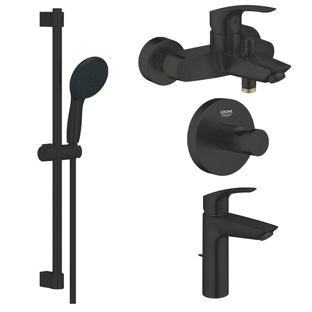 Комплектът включва: едноръкохватков смесител за баня 1/2" Eurosmart за еднодупков монтаж, едноръкохватков смесител за вана 1/2" Eurosmart за стенен монтаж със S-връзки и аератор, както и душ система Tempesta 110, състояща се от ръчен душ, тръбно окачване (600 мм) и шлаух (1750 мм). Всички компоненти са изработени от висококачествен метал и имат матово черно покритие. За допълнително удобство, в комплекта е включена и практична закачалка за хавлия Essentials с товароносимост до 5 кг.