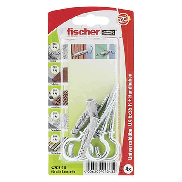 Универсалният дюбел на FISCHER UX6x35RHK, изработен от висококачествен найлон. Анкерът държи в бетон, но също и в газобетон, зидария и в гипсокартон. Формираният ръб е практичен. Това означава, че дюбелът не се плъзга в пробития отвор, когато се постави. Ъгловите куки вече са включени в опаковката. Това спестява търсенето и гарантира, че те също пасват перфектно с дюбела. Този дюбел е в комплект с ъглова кука, която може да се използва за закачане на картини, рафтове и стенни шкафове.