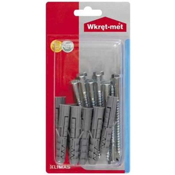 Комплект дюбели за бетон с винтове с шестостенна глава на марката WKRET-MET. Изработен от полипропилен и стомана. В блистер от 7 бр.