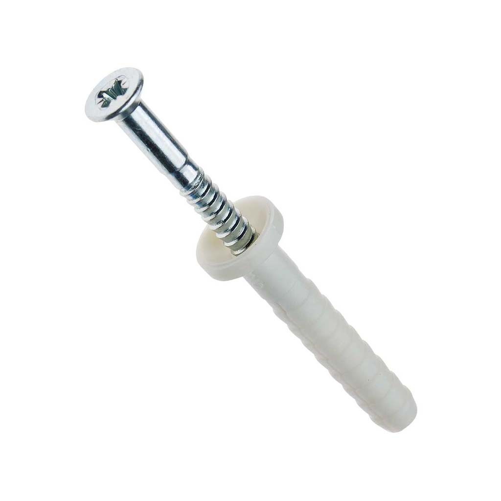Пластмасов дюбел с метален винт тип К6 на марката KNAUF, предназначен за закрепване на таванни, стенни и подови профили UW, MD и CW.