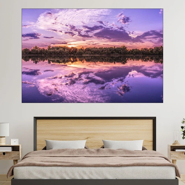 Декорация за стена (картина, пано) с мотив "Езеро с лилави води - картина пано за стена". Изработена от олекотено PVC с дебелина 5 мм или канава от 100% памук, опъната върху дървена подрамка с дебелина 5 см. Изображението се печата с висококачествен UV печат, което е гаранция за запазване на цветовете с години!
