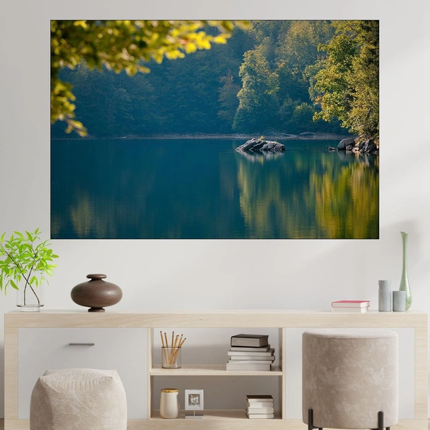 Декорация за стена (картина, пано) с мотив "Езеро със спокойни води в гората - картина пано за стена". Изработена от олекотено PVC с дебелина 5 мм или канава от 100% памук, опъната върху дървена подрамка с дебелина 5 см. Изображението се печата с висококачествен UV печат, което е гаранция за запазване на цветовете с години!