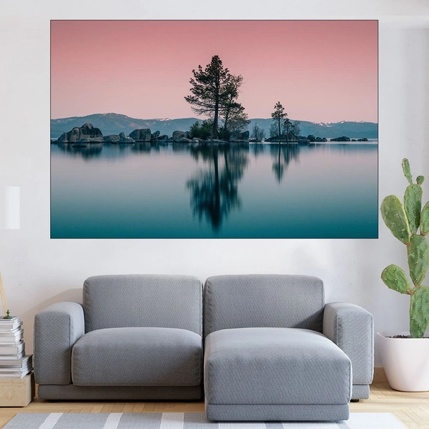 Декорация за стена (картина, пано) с мотив "Изглед от езерото Тахо - картина пано за стена". Изработена от олекотено PVC с дебелина 5 мм или канава от 100% памук, опъната върху дървена подрамка с дебелина 5 см. Изображението се печата с висококачествен UV печат, което е гаранция за запазване на цветовете с години!