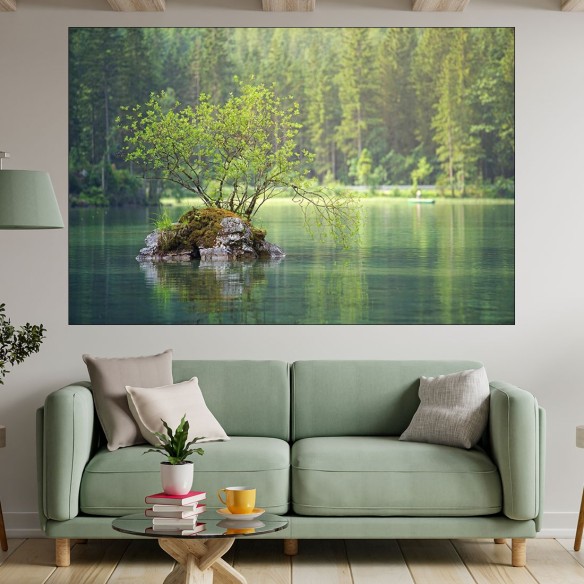 Декорация за стена (картина, пано) с мотив "Красиво езеро с дърво - картина пано за стена". Изработена от олекотено PVC с дебелина 5 мм или канава от 100% памук, опъната върху дървена подрамка с дебелина 5 см. Изображението се печата с висококачествен UV печат, което е гаранция за запазване на цветовете с години!