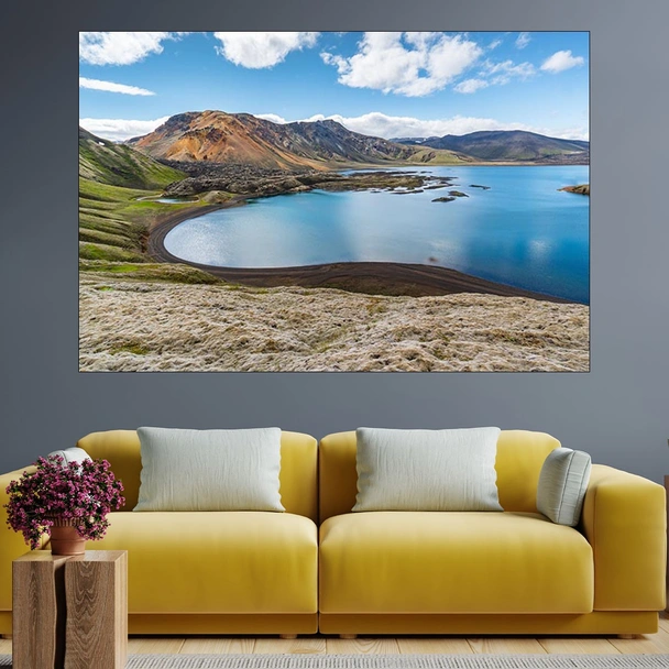 Декорация за стена (картина, пано) с мотив "Красиво езеро в Исландия - картина пано за стена". Изработена от олекотено PVC с дебелина 5 мм или канава от 100% памук, опъната върху дървена подрамка с дебелина 5 см. Изображението се печата с висококачествен UV печат, което е гаранция за запазване на цветовете с години!