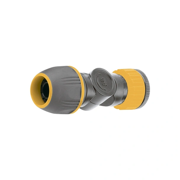 Съединителят е проектиран за бързо свързване на маркуча за напояване от 1/2''до 3/4'' с резбова връзка от 1/2 “-3/4”. Въртящият механизъм позволява да се променя посоката на връзките със 180 °, като по този начин маркуча се предпазва от прегъване и усукване.