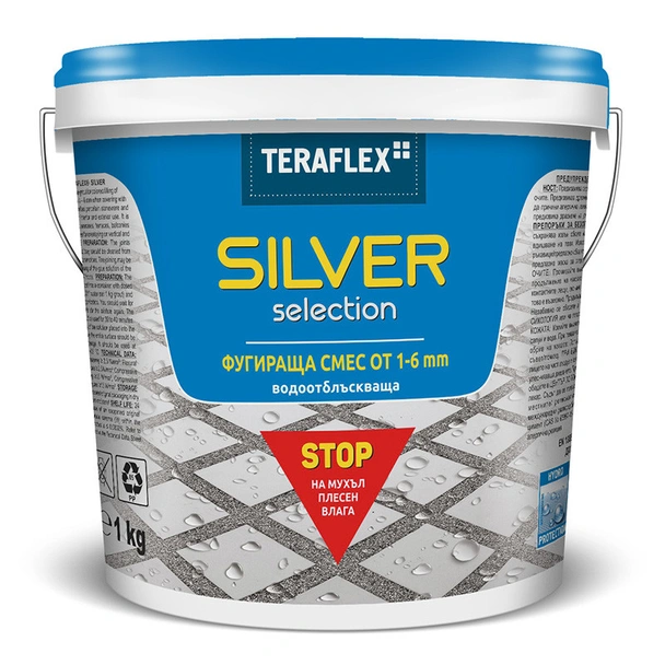 Силно еластична водоотблъскваща фугираща смес от серията Silver selection Teraflex с морскосин цвят, предназначена за фуги от 1 до 6 мм.