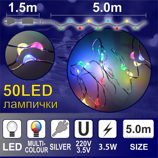 Гирлянд Купър ENIGMA с дължина 5 м, състоящ се от 50 разноцветни LED /диодни/ лампички, подходящ за вътрешна и външна употреба.