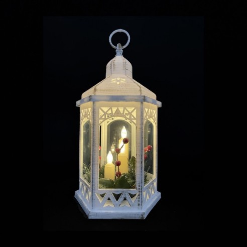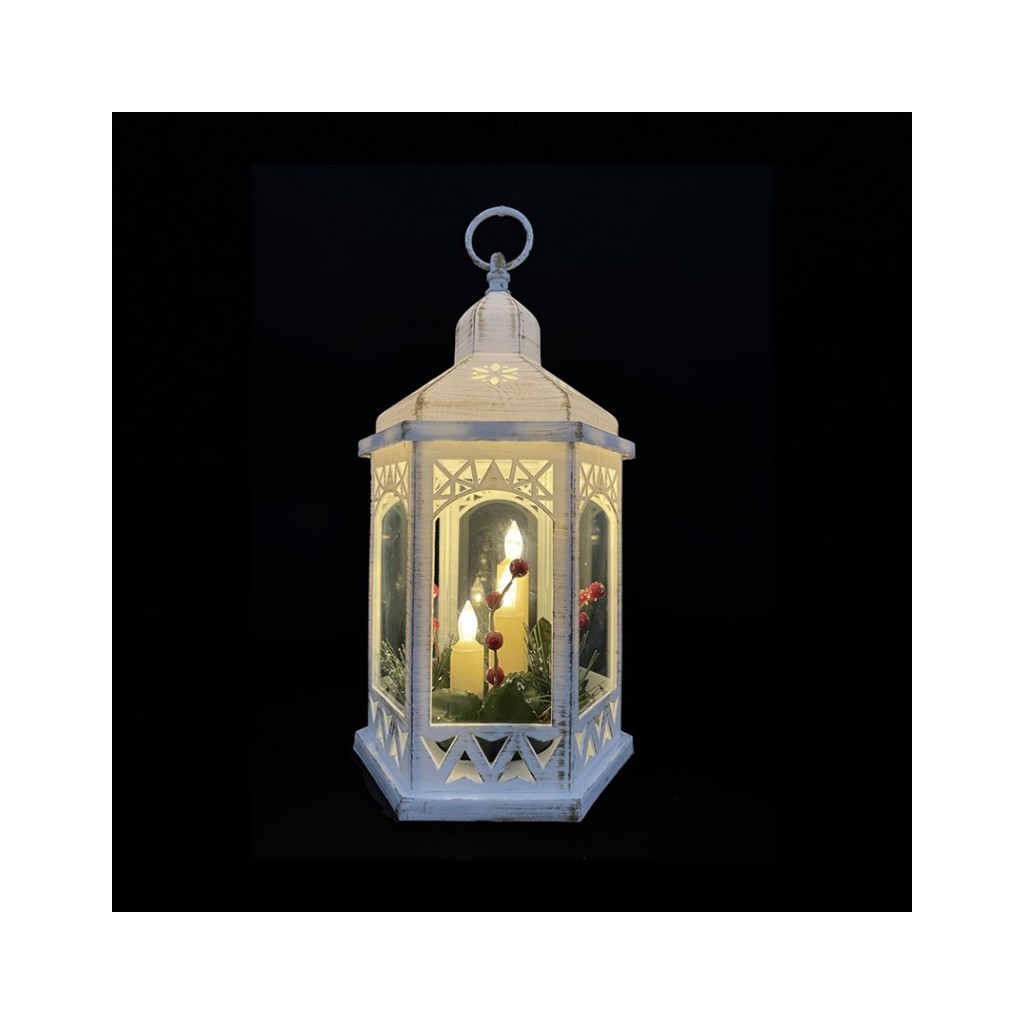 Стилен LED коледен фенер със свещи на марката LIGHTEX в бял цвят, светещ с топло бяла светлина.