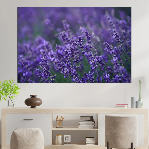 Декорация за стена (картина, пано) с мотив "Цъфнала в полето лавандула - картина пано за стена". Изработена от олекотено PVC с дебелина 5 мм или канава от 100% памук, опъната върху дървена подрамка с дебелина 5 см. Изображението се печата с висококачествен UV печат, което е гаранция за запазване на цветовете с години!