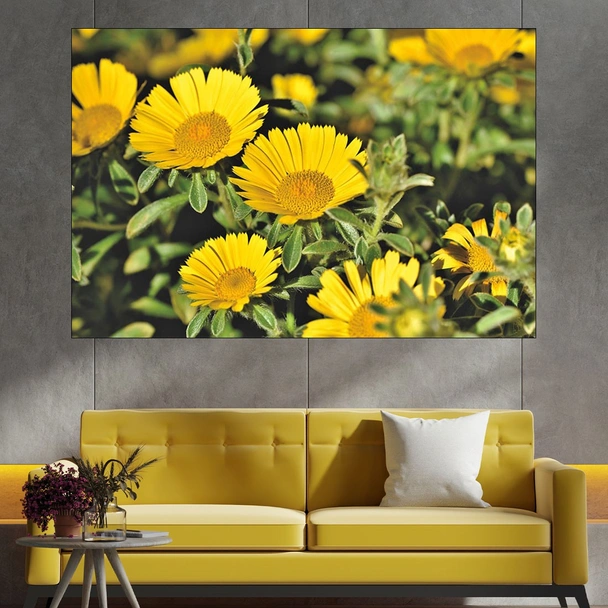 Декорация за стена (картина, пано) с мотив "Цъфнала жълта Астра - картина пано за стена". Изработена от олекотено PVC с дебелина 5 мм или канава от 100% памук, опъната върху дървена подрамка с дебелина 5 см. Изображението се печата с висококачествен UV печат, което е гаранция за запазване на цветовете с години!