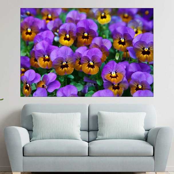 Декорация за стена (картина, пано) с мотив "Лилави теменужки - картина пано за стена". Изработена от олекотено PVC с дебелина 5 мм или канава от 100% памук, опъната върху дървена подрамка с дебелина 5 см. Изображението се печата с висококачествен UV печат, което е гаранция за запазване на цветовете с години!