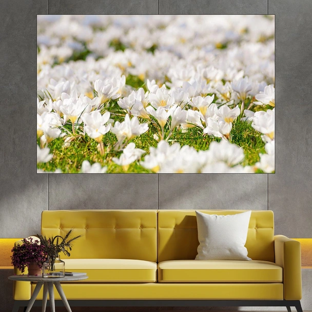 Декорация за стена (картина, пано) с мотив "Поляна с бели мизухари - картина пано за стена". Изработена от олекотено PVC с дебелина 5 мм или канава от 100% памук, опъната върху дървена подрамка с дебелина 5 см. Изображението се печата с висококачествен UV печат, което е гаранция за запазване на цветовете с години!