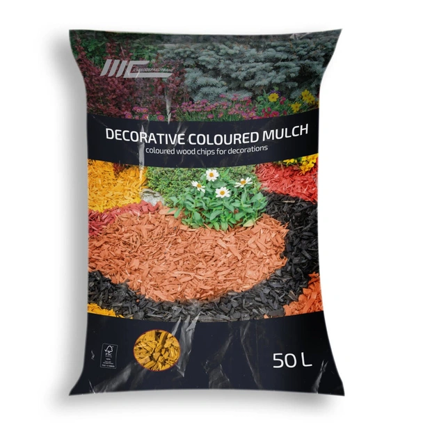Мулч 50 л жълт е изцяло натурален продукт, произведен от 100% естествена иглолистна дървесина, оцветен с безопасни водоразтворими бои, безвредни за хора, животни и почвата. Този декоративен дървесен чипс е не само красив завършек за вашите градински проекти, но и изключително полезен за здравословното развитие на растенията.