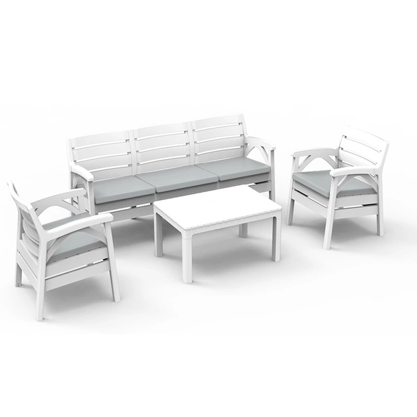 Градински комплект Santana на VIOLET HOUSE в бял цвят, включващ маса, диван и два броя фотьойли с възглавници.