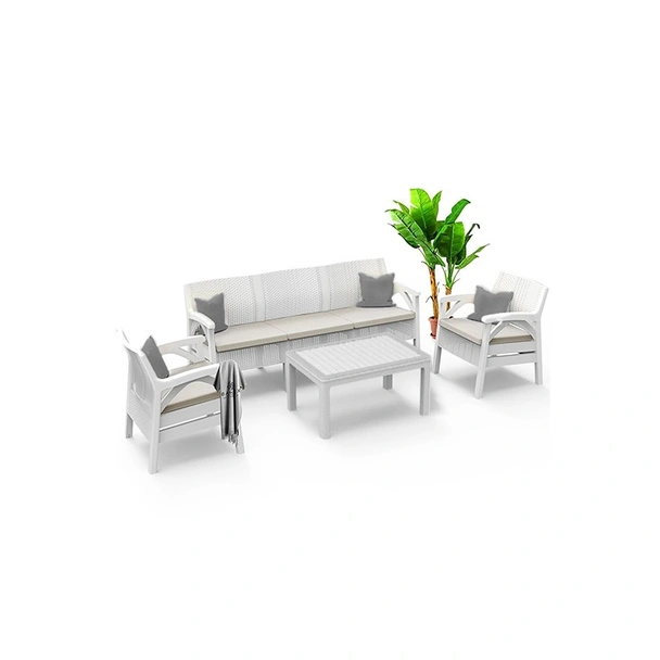 Градински комплект Santana на VIOLET HOUSE в бял цвят, включващ маса, триместен дивана и два стола с възглавници.
