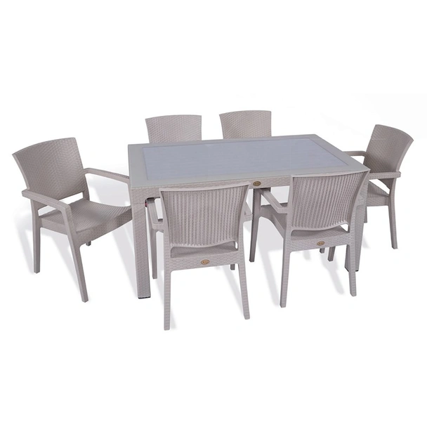 Градински комплект от колекцията Zeugma Rattan на турския производител MEVSIM, включващ маса с шест стола със стилен дизайн тип ратанова плетка.